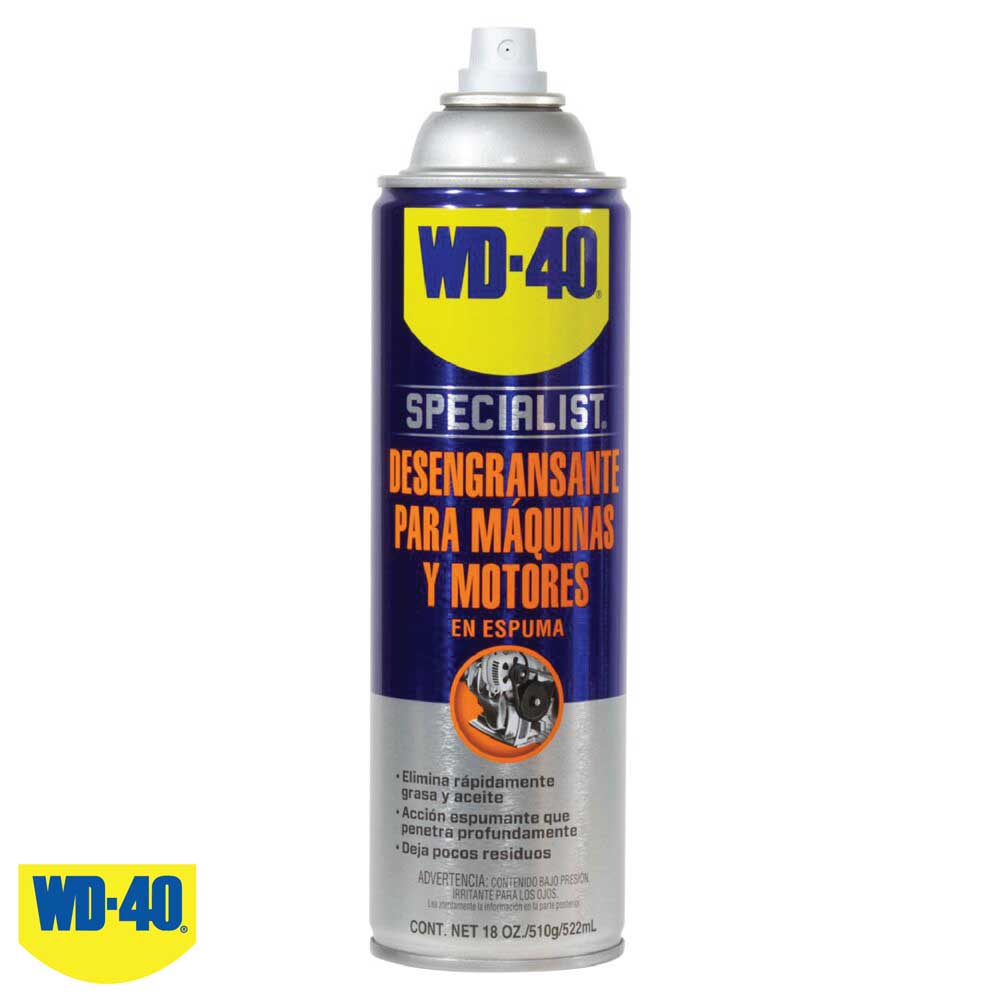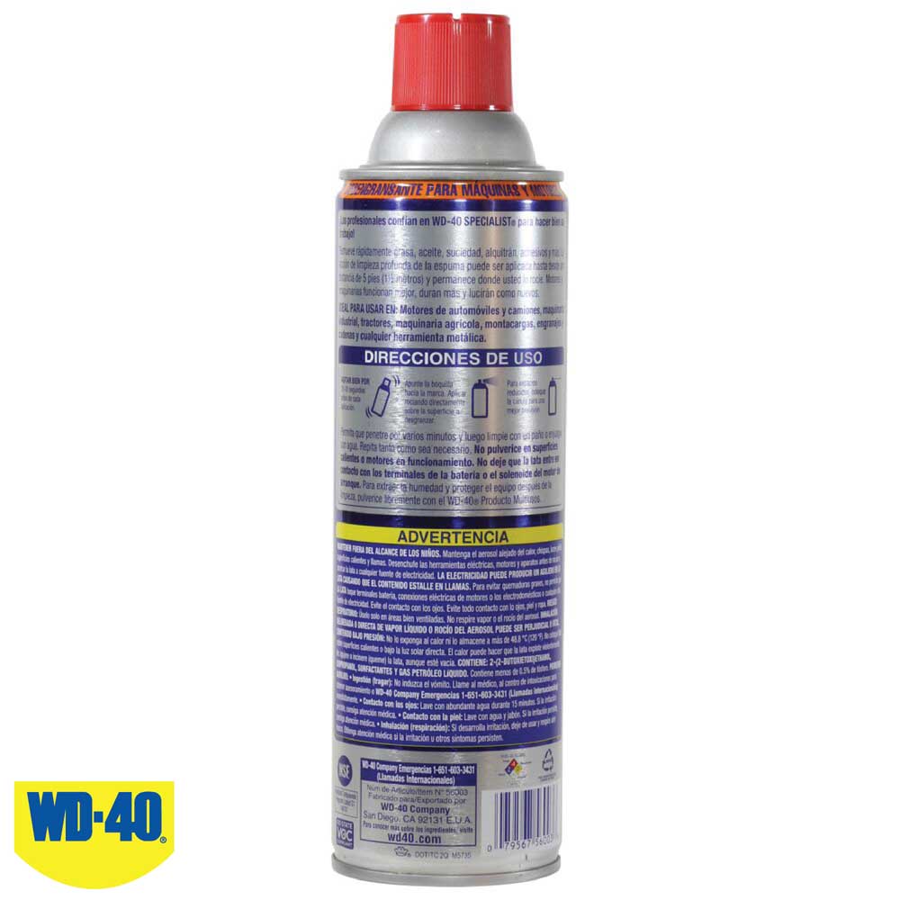 WD-40 Specialist® Machine & Engine Degreaser Foaming Spray hace que el equipo funcione de manera más suave, dure más y parezca nuevo. Este aerosol es una fórmula a base de agua de bajo residuo con acción espumosa que penetra profundamente en las grietas para obtener resultados completamente limpios. Equipado con una boquilla capaz de rociar poderosos a larga distancia de hasta 5 pies y también incluye una pajita de chorro de precisión para una aplicación controlada. Elimina rápidamente grasa, aceite, suciedad, alquitrán, adhesivos y más sin desmontar el motor. Funciona muy bien en motores de automóviles y camiones, tractores, montacargas, engranajes y cadenas, maquinaria industrial, equipos agrícolas y otras herramientas metálicas. Seguro para usar en la mayoría de los metales cuando se usa según las instrucciones.. Elimina rápidamente Aceite, Grasa, Alquitrán, Salitre y todo tipo de suciedad, secando rápidamente y sin dejar residuo. Potente flujo aerosol.