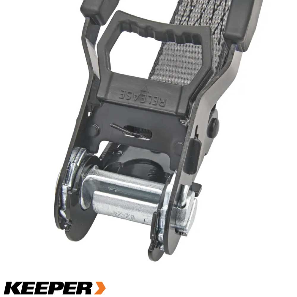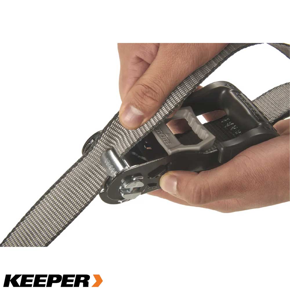 La correa de amarre con trinquete KwikFeed de 4,98 m (16 pies) incorpora la tecnología patentada de Keeper que permite deslizar la correa fácilmente. Fácil para principiantes y rápido para expertos. No es necesario pasar toda la correa por el trinquete al asegurar la carga. Esta correa ofrece fiabilidad y durabilidad al asegurar la carga, gracias a su cinta ExtremeEdge, un 30 % más resistente a los cortes y un 67 % más resistente a la abrasión. Con un gancho en forma de S recubierto que incluye un clip de seguridad para evitar que se suelte. Mango extragrande que permite asegurar la carga incluso con guantes. ||Keeper||