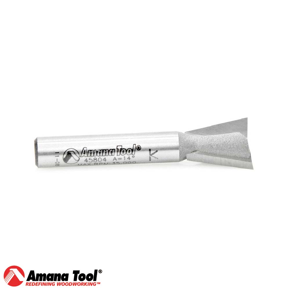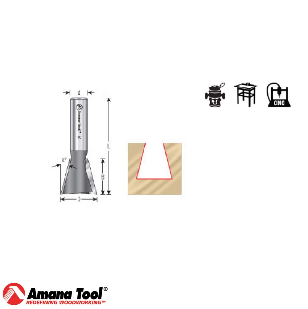 La fresa de cola de milano de 14° se utiliza con plantillas de cola de milano semiciegas comunes, así como con plantillas Omnijig®, Incra® y Leigh®. ||Amana tool||