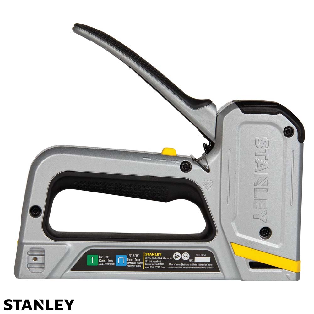 •	Mango plástico de alto impacto con caucho que cubre manija metálica que ejerce presión en el empujador de la grapa.