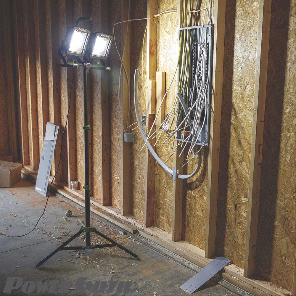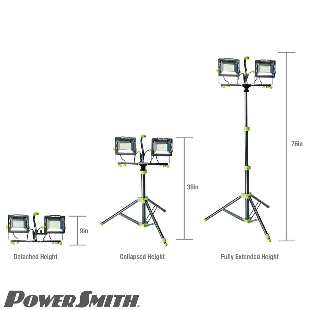 Obtenga resultados profesionales con la luz de trabajo LED de doble cabezal con trípode de grado profesional PowerSmith de 20,000 lúmenes. PowerSmith es líder en la industria con una mayor relación calidad-precio en lúmenes. Los cabezales de la lámpara se pueden desmontar del trípode con solo girar el mecanismo de liberación rápida. El trípode ajustable, totalmente metálico, cuenta con cierres abatibles para bloquear y desbloquear la altura del trípode de forma rápida y sencilla.