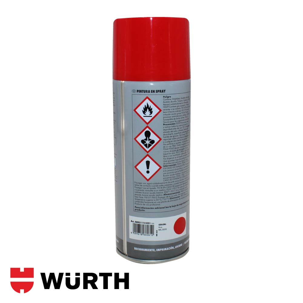 La pintura en spray Würth está formulada con base acrílica y nitroalcano, lo que le confiere un secado rápido y una excelente adherencia sobre diversos materiales. Se presenta en envases de 400 ml (250 g netos) y está disponible en una amplia gama de colores normalizados por código RAL. Su aplicación es sencilla gracias a su buena atomización y cobertura uniforme. Es resistente al agua y apta para trabajos tanto en interiores como exteriores. No es adecuada para aplicaciones que requieran resistencia a altas temperaturas.