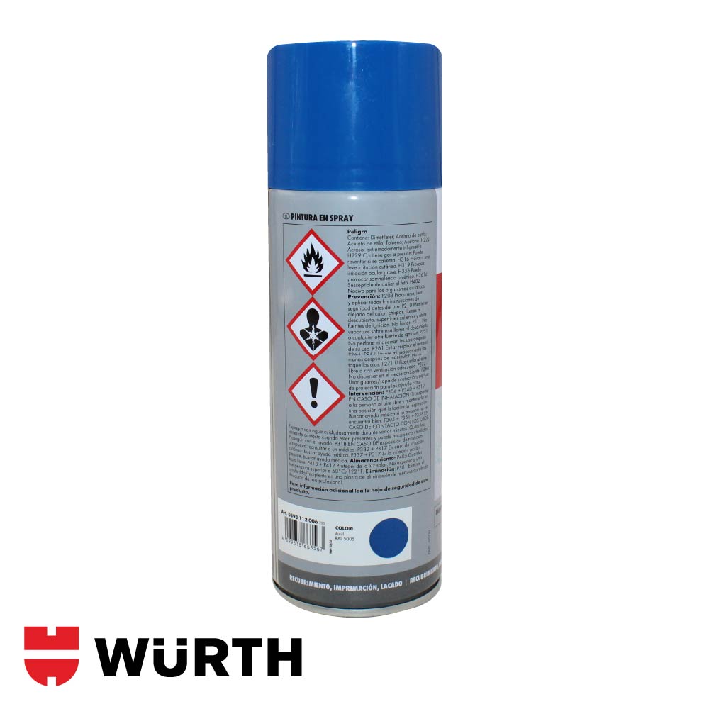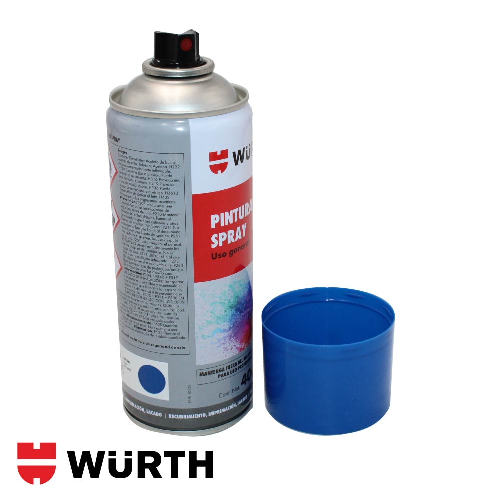 La pintura en spray Würth está formulada con base acrílica y nitroalcano, lo que le confiere un secado rápido y una excelente adherencia sobre diversos materiales. Se presenta en envases de 400 ml (250 g netos) y está disponible en una amplia gama de colores normalizados por código RAL. Su aplicación es sencilla gracias a su buena atomización y cobertura uniforme. Es resistente al agua y apta para trabajos tanto en interiores como exteriores. No es adecuada para aplicaciones que requieran resistencia a altas temperaturas.