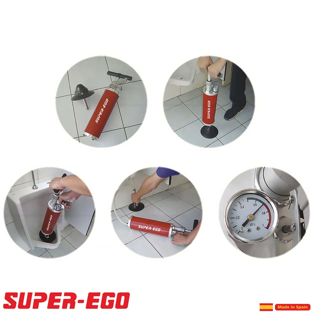 Desatascador por golpe de aire con manómetro integrado para un desatasco seguro, con adaptador y tubo flexible para desatascos en lugares de difícil acceso.