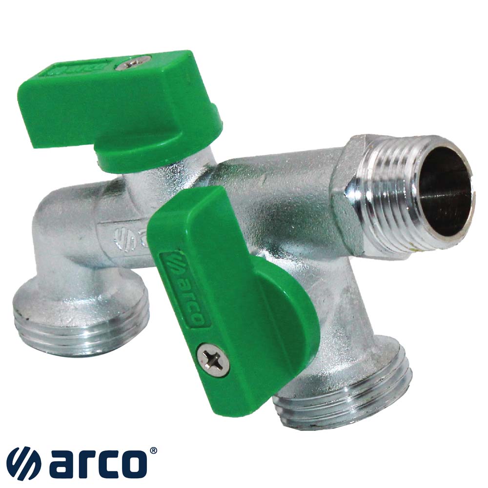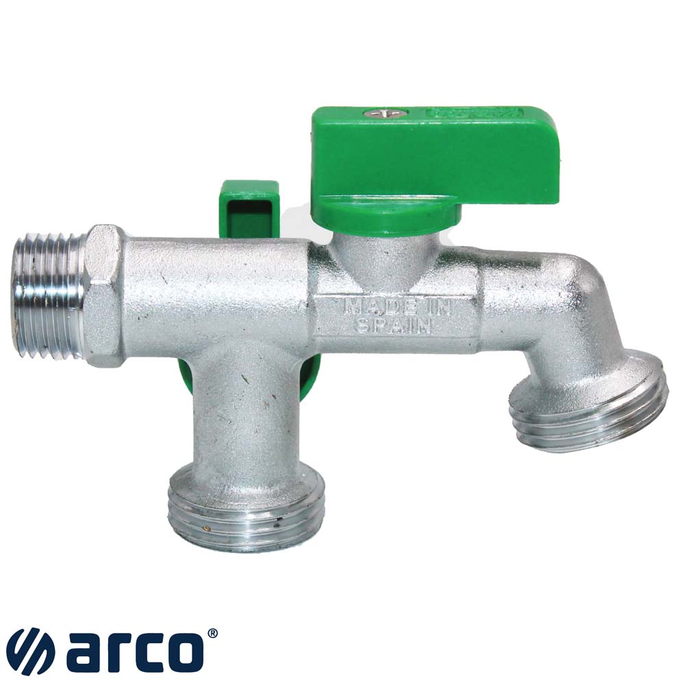 Grifos de obturador esférico (1/4 de vuelta) con dos salidas independientes para instalaciones exteriores o interiores de fontanería como jardines, terrazas, patios, etc.